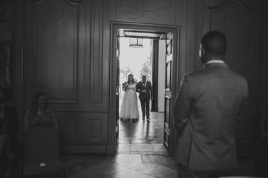 Zur standesamtlichen Trauung ging es dann in den wunderschönen grünen Trauraum des Schlosses, wo bereits der Bräutigam – und zwei weitere ganz besondere Menschen – warteten: die Großeltern des Brautpaars, die an diesem Tag ihren 70. Hochzeitstag feierten. Ein echtes Vorbild für den gemeinsamen Start in die Ehe – und so voller Liebe, dass es allen unter die Haut ging.
